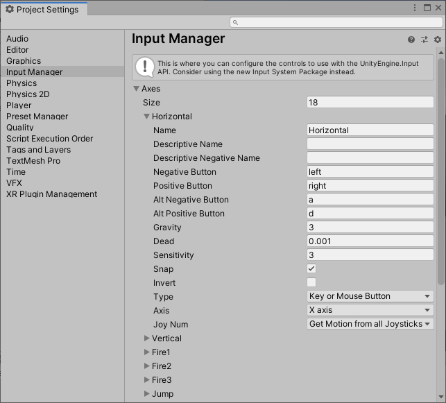 Edit - ProjectSettings - InputManager - Axes