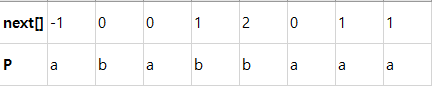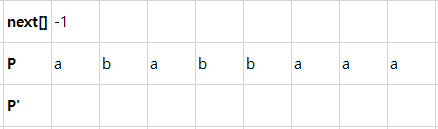 표에서 P가 가진 첫문자 'a' 의 인덱스인 0 위치에 해당하는 next[0]의 값을 보면 -1이 들어있다.