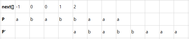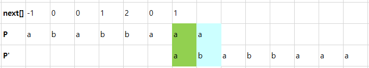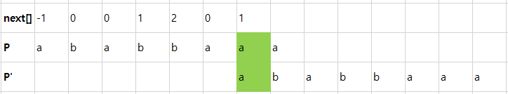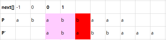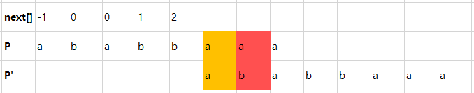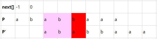 그런데, P의 b와 P'의 a가 불일치한다. 하지만 next4]는 채워져있기 때문에 다시 P'을 한 칸 밀어준다.