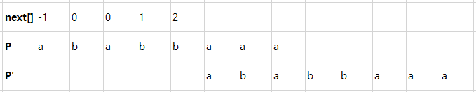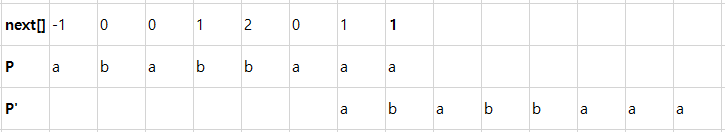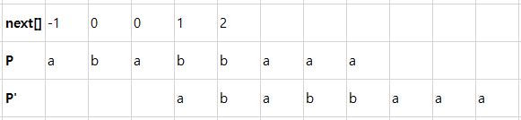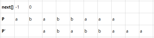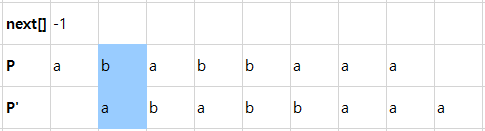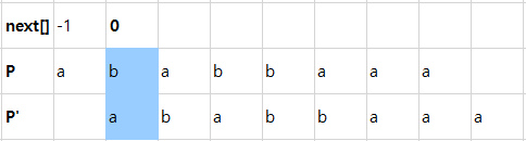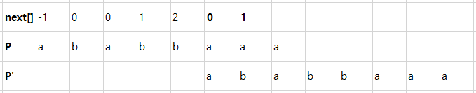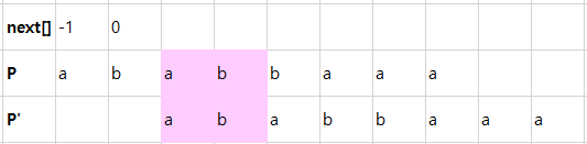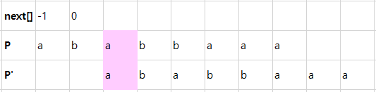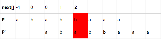 그리고 b와 a가 불일치했기 때문에 next[2]를 구하기 위해 패턴(P')을 한 칸 이동시킨다.